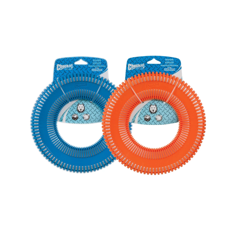 A Chuckit! Rugged Flyer egy strapabíró frizbi, amelyet kifejezetten erős állkapcsú, aktív kutyák számára terveztek, így ideális választás intenzív játékhoz.