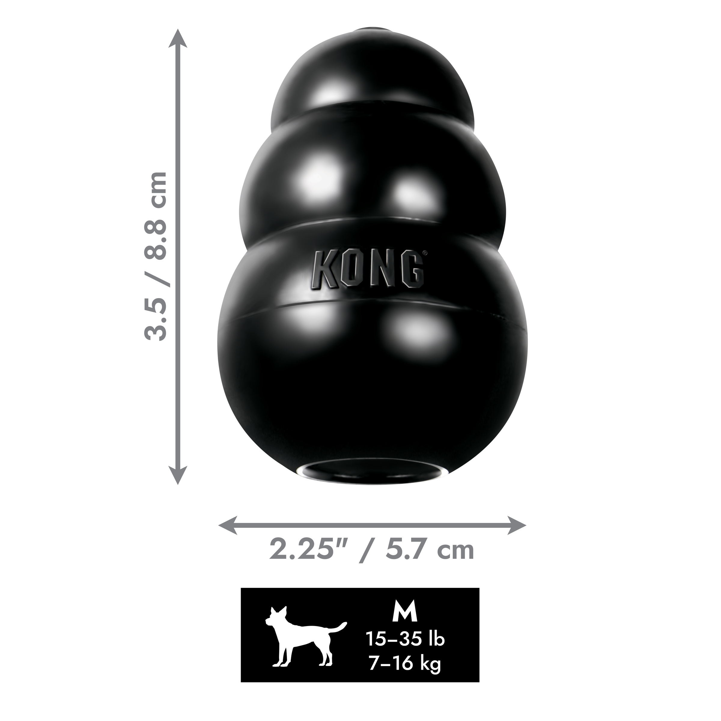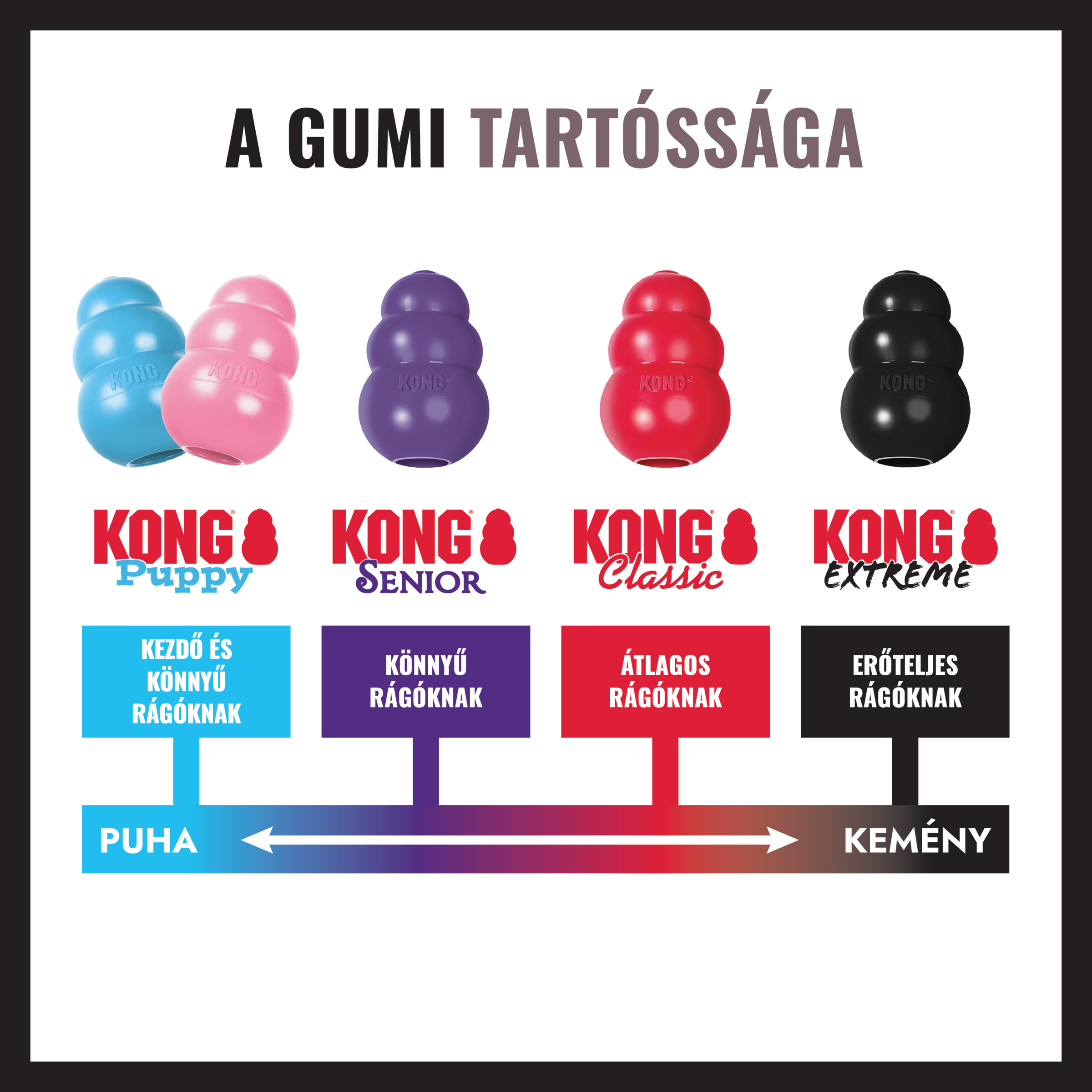 A legtartósabb, legerősebb KONG a piacon. Bevethető a legerősebb fogazattal rendelkező kutyusok esetében is. Az egyedülálló, természetes gumiból készült KONG nem jelent veszélyt kutyusod számára. Kedvére rágcsálhatja, ezzel elősegítve a természetes rágóösztön levezetését, sőt még jutalomfalattal vagy kutyapástétommal is megtölthető, fokozva ezzel az örömöt és motivációt kutyád számára.